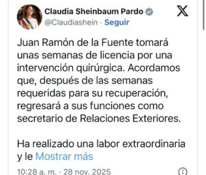 “Juan Ramón de la Fuente tomará unas semanas de licencia por una intervención quirúrgica. Acordamos que, después de las semanas requeridas para su recuperación, regresará a sus funciones como secretario de Relaciones Exteriores.” Público en redes .