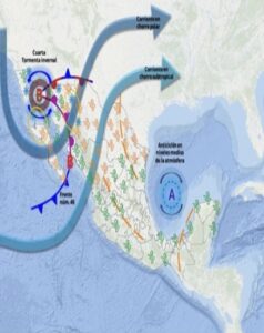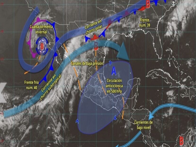 Este lunes la 4ta Tormenta Invernal de la temporada y el frente frío núm. 40 se desplazarán sobre el noroeste y norte de México, propiciando lluvias puntuales fuertes, rachas de viento, ambiente frío a muy frío y posible caída de nieve o aguanieve en zonas serranas de Baja California, Sonora y Chihuahua.