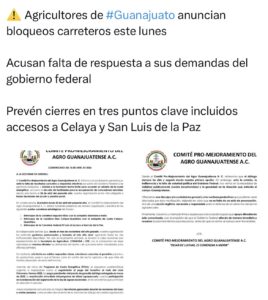 Agricultores de Guanajuato anunciaron bloqueos carreteros para el lunes 20 de abril.