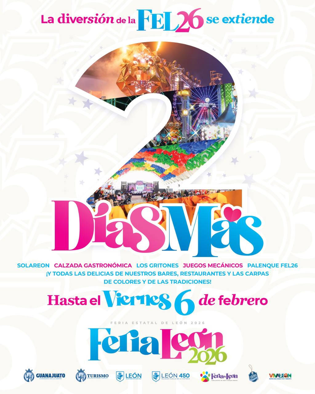 León, Guanajuato. A 26 de enero del 2026. La Feria Estatal de León y Parque Urbano anuncia la extensión de su edición 2026 por dos días adicionales, brindando al público la oportunidad de seguir disfrutando de una de las celebraciones más emblemáticas del país los días jueves 5 y viernes 6 de febrero, dentro del Recinto Ferial.