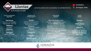 Chubascos con lluvias puntuales fuertes (25 a 50 mm): Puebla (regiones Sierra Norte, Sierra Nororiental, Valle de Serdán y Tehuacán-Sierra Negra), Veracruz (regiones Capital y Los Tuxtlas), Campeche (oeste), Yucatán (sur) y Quintana Roo (norte, centro y sur).
