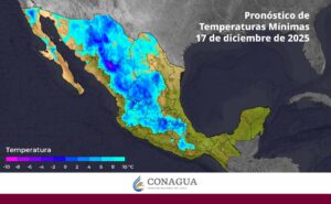 Temperaturas mínimas de -5 a 0 °C con heladas:zonas altas de Baja California, Sonora, Zacatecas, Estado de México, Tlaxcala y Puebla.