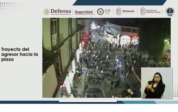 El fiscal de Michoacán, Carlos Torres Piña, mostró en conferencia de prensa, este lunes 3 de noviembre de 2025, las imágenes del trayecto que realizó el agresor rumbo a la plaza, para posteriormente ultimarlo a balazos alrededor de las 20:00 hora local.