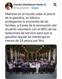 “Mientras en el mundo sube el precio de la gasolina, en México protegemos la economía de las familias, a través de la renovación del acuerdo voluntario con el 96% de las estaciones de servicio para que la gasolina regular se mantenga en menos de 24 pesos por litro.” Compartió.
