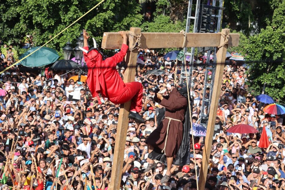 Para el Viernes Santo la jornada fue larga pero llena de orgullo, con la representación de La Sentencia, Las Tres Caídas, la Crucifixión y el recorrido de La Judea, para cerrar la jornada con el ahorcamiento de Judas, en el bello jardín principal que lució repleto.
