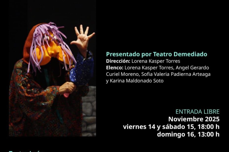 TIZZA: Presentada por Teatro Demediado bajo la dirección de Lorena Kasper Torres, quien participa en el elenco acompañada de Ángel Gerardo Curiel Moreno, Sofía Valeria Padierna Arteaga y Karina Maldonado Soto los viernes 14 y sábado 15 de noviembre a las 18:00 horas, además del domingo 16 a las 13:00 horas.