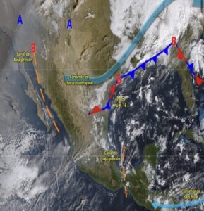 Para hoy, el frente núm. 16 se extenderá sobre el norte y noreste de México, y en interacción con la corriente en chorro subtropical y con un canal de baja presión, ocasionará lluvias puntuales fuertes con descargas eléctricas en Nuevo León y Tamaulipas, así como chubascos en Coahuila y San Luis Potosí.