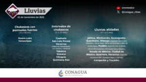 Intervalos de chubascos (5 a 25 mm): Coahuila, San Luis Potosí, Veracruz (regiones Papaloapan, Los Tuxtlas y Olmeca), Tabasco Oaxaca, Chiapas y Quintana Roo.