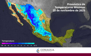 Temperaturas mínimas de 0 a 5 °C con posibles heladas: Zonas serranas de Baja California, Sonora, Coahuila, San Luis Potosí, Jalisco, Michoacán, Guanajuato, Querétaro, Hidalgo, Morelos, Veracruz y Oaxaca.