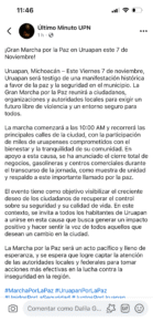 El punto de reunión será en la llamada Glorieta de McDonald’s, sobre el Paseo Lázaro Cárdenas, y avanzarán al Centro Histórico de Uruapan, se pidió a los asistentes vestir con camisa blanca o negra.