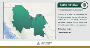 Viento de 30 a 45 km/h con rachas de 65 a 80 km/h y posibles torbellinos y/o tornados: Chihuahua (norte) y Coahuila (noroeste).