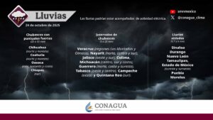 Chubascos con lluvias puntuales fuertes (25 a 50 mm): Chihuahua (norte y noreste) y Coahuila (norte y noreste); Oaxaca (este, suroeste y costa) y Chiapas (sur).