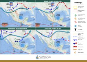 Este viernes el frente frío núm. 10 recorrerá el norte del país, asociado con la corriente en chorro subtropical y una vaguada en niveles medios y altos de la atmósfera, ocasionarán lluvias puntuales fuertes en Chihuahua (norte y noreste) y Coahuila (norte y noreste); rachas de viento de 65 a 80 km/h y posibles torbellinos y/o tornados en el norte de Chihuahua y noroeste de Coahuila.