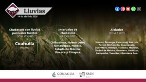 Dichas lluvias podrían estar acompañadas con descargas eléctricas y posible caída de granizo; además, se prevén lluvias aisladas en zonas de Sonora, Durango, Zacatecas y San Luis Potosí.