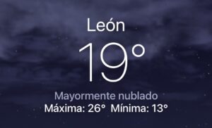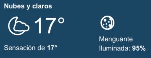Durante la noche, las temperaturas estarán cercanas a los 17°C. Vientos del Noroeste con una velocidad media de 7 km/h.