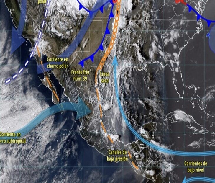 Durante esta noche y madrugada del sábado, el frente núm. 39 sobre el norte del país y una línea seca sobre el noreste de México, ocasionarán lluvias y chubascos con descargas eléctricas en Coahuila, Nuevo León, Tamaulipas y San Luis Potosí; así como fuertes rachas de viento de 50 a 70 km/h en Chihuahua, Durango, Nuevo León y Tamaulipas; y con posible formación de torbellinos en el norte de Coahuila.