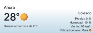 Durante la noche, estará despejado  con temperaturas cercanas a los 23°C. Vientos del Oeste a lo largo del día, con una velocidad media de 6 km/h.