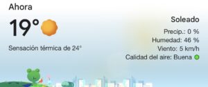 Durante la noche, habrá temperaturas cercanas a los 18°C. Vientos del Oeste a lo largo del día, con una velocidad media de 12 km/h.