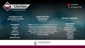 Por otra parte, canales de baja presión sobre el centro y sureste del país, en combinación con el ingreso de humedad del océano Pacífico y golfo de México e inestabilidad atmosférica, ocasionarán lluvias y chubascos en estados del occidente, centro, oriente, sur y sureste del territorio nacional, incluida la península de Yucatán, con lluvias puntuales fuertes en Michoacán (centro), Chiapas (este), Tabasco (centro y este), Campeche (este) y Quintana Roo (centro y sur).