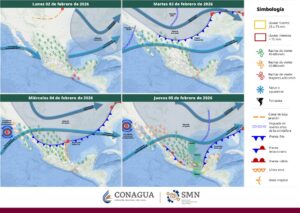 También prevalecerá viento de componente norte con rachas de 70 a 90 km/h en el istmo y golfo de Tehuantepec, así como rachas de 40 a 60 km/h en Yucatán y Quintana Roo.