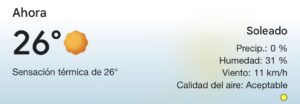 En este momento se registra sensación térmica de 26 grados centígrados.