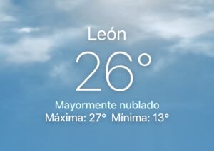Hoy en León, lluvia débil con cielo parcialmente nuboso esta mañana, con temperaturas alrededor de 18°C.
