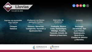 Este miércoles, una vaguada en niveles medios y altos de la atmósfera se desplazará sobre el sureste del país, generando rachas de viento, chubascos y lluvias fuertes con descargas eléctricas y posible caída de granizo en dichas regiones, así como lluvias puntuales muy fuertes en Chiapas y Tabasco.
