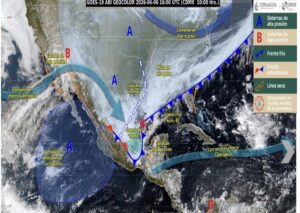 La masa de aire polar asociada al frente mantendrá el evento de “Norte” con rachas de viento de 60 a 80 km/h en Tamaulipas, Veracruz e istmo y golfo de Tehuantepec; así como el descenso de las temperaturas en el norte, centro y oriente del territorio nacional.