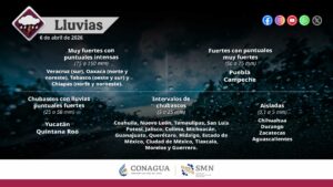 Intervalos de chubascos (5 a 25 mm): Coahuila, Nuevo León, Tamaulipas, San Luis Potosí, Jalisco, Colima, Michoacán, Guanajuato, Querétaro, Hidalgo, Estado de México, Ciudad de México, Tlaxcala, Morelos y Guerrero.