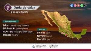 Finalmente circulación anticiclónica en niveles medios de la atmósfera, mantendrá el ambiente caluroso a muy caluroso en el occidente, sur y sureste de México, continuando con la onda de calor en zonas de Jalisco (centro, sur y suroeste), Michoacán (centro y oeste), Guerrero (noroeste, centro y sur) y Oaxaca (centro) e iniciará una onda de calor en Sinaloa (sur), Nayarit (norte) y Morelos (sur).