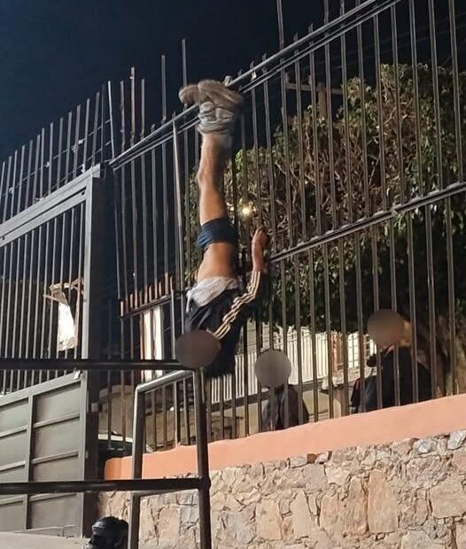 Sin embargo, en su intento por cruzar, la situación tomó un giro inesperado cuando quedó colgado de la misma estructura que intentaba brincar.