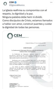 “La Iglesia reafirma su compromiso con el respeto, la dignidad y la paz. Ninguna palabra debe herir ni dividir. Como discípulos de Cristo, estamos llamados a hablar con amor, construir puentes y cuidar la dignidad de todas las personas.” Compartieron en redes .