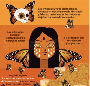 Se dice que, si el Día de Muertos una persona percibe la presencia de uno de estas mariposas , se deber observar en silencio, ya que su aleteo susurra el mensaje de las personas fallecidas.