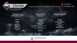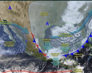 Asimismo, prevalecerá el evento de “Norte” con rachas de viento de 70 a 90 km/h en Oaxaca y Chiapas (istmo y golfo de Tehuantepec), y rachas de 50 a 60 km/h en las costas de Tamaulipas, Veracruz, Tabasco, Campeche, Yucatán y Quintana Roo (disminuyendo durante el día).