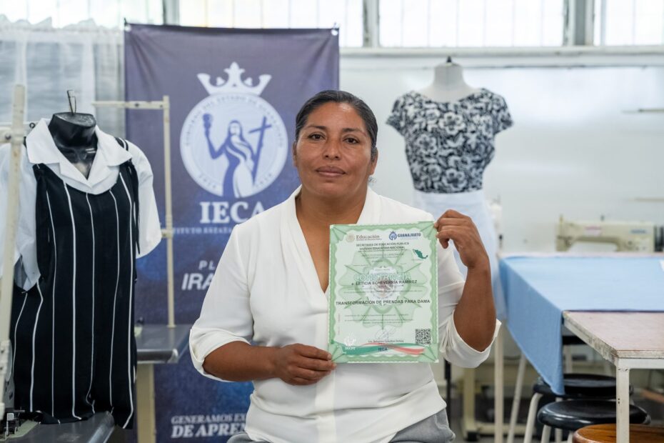 Una de las beneficiarias es Leticia Echeverría Ramírez, habitante de la comunidad San José de los Pinos, en Irapuato, quien encontró en el IECA una alternativa para generar ingresos y apoyar a su familia. Con cursos de costura, confección y reparación de prendas, Leticia adquirió habilidades que le permiten emprender su propio negocio y abrir nuevas oportunidades laborales.