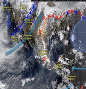 A su vez el frente frío núm. 39 se extenderá sobre el noroeste de la República Mexicana generando rachas de viento de hasta 80 km/h en la región y propiciando descenso de la temperatura, lluvias y chubascos.