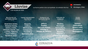 Intervalos de chubascos (5 a 25 mm): Sinaloa, Durango, Tamaulipas, Querétaro, Morelos, Tlaxcala y Ciudad de México.