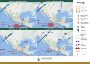 Para este jueves, una zona de baja presión con probabilidad para desarrollo ciclónico al sur de Guerrero y la vaguada monzónica que se extenderá frente a las costas del Pacífico Sur Mexicano, ocasionarán lluvias puntuales intensas en Guerrero; muy fuertes en Michoacán, Colima y Nayarit; fuertes en Jalisco, e intervalos de chubascos en Sinaloa.