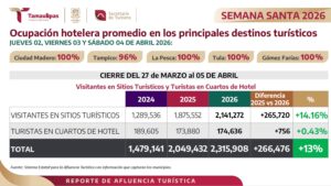 Ciudad Victoria, Tamaulipas.- El crecimiento en el número de visitantes a sitios turísticos de Tamaulipas aumentó 14.1 por ciento, es decir, más de 265 mil personas en comparación al año anterior, registrando una ocupación hotelera en algunos sitios del 100%, lo que generó una derrama económica que supera los 2 mil 150 millones de pesos, afirmó el gobernador Américo Villarreal Anaya, quien destacó los resultados de la Estrategia Interinstitucional de Semana Santa 2026 para brindar seguridad, asistencia y toda la hospitalidad tamaulipeca a quienes disfrutaron de su estancia en nuestro estado.