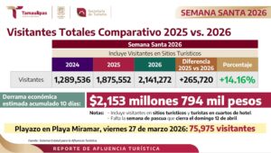 El secretario de Turismo, Benjamín Hernández, detalló que durante la Semana Santa 2026 se registraron 2,141,272 visitantes a sitios turísticos; 265 mil 720 personas más que en el mismo periodo del año anterior, lo que representa un incremento del 14.16%, con una derrama económica en 10 días de 2,153,794 pesos, destacando la playa Miramar, de Madero, con 933,876 visitantes, y playa Bagdad con 348,187 visitantes, un incremento en este sitio de 476% respecto a 2025, en el municipio de Matamoros.