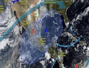 Asimismo, se prevén vientos fuertes con rachas sobre entidades del norte de México, con posible formación de torbellinos en el norte de Coahuila.