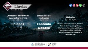 Intervalos de chubascos (5 a 25 mm): Coahuila y Oaxaca.