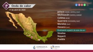 Finalmente una circulación anticiclónica en niveles medios de la atmósfera continuará generando ambiente caluroso a muy caluroso sobre gran parte de la República Mexicana, además se mantendrá la onda de calor en Jalisco (oeste, centro y sur), Michoacán (centro y oeste), Colima (este), Guerrero (noroeste y sur), Morelos (sur) y Oaxaca (sur), finalizando a partir de este día en Sinaloa, Nayarit y Puebla.