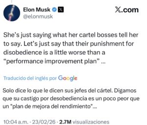 “Solo dice lo que le dicen sus jefes del cártel. Digamos que su castigo por desobediencia es un poco peor que un “plan de mejora del rendimiento”. Publicó en redes Musk