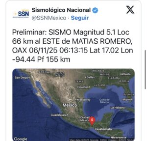 Este primero se reportó a las 6:13 am., a 66 kms al este de Matías Romero, Oaxaca de 5.1 de magnitud .