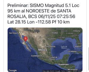 Posteriormente a las 7:25 h, se registró otro sismo, de 5.1 de magnitud, a 95 kms al noroeste de Santa Rosalía, Baja California Sur.
