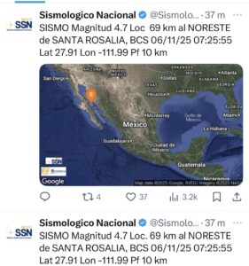 Hasta el momento, se han reportado 2 réplicas en Baja California Sur de 4.7 de magnitud.