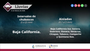 Este jueves, el frente núm. 34 y una vaguada polar se desplazarán lentamente sobre el noroeste del territorio nacional, en interacción con las corrientes en chorro polar y subtropical, originarán descenso de temperatura, rachas de viento, lluvias y chubascos en dicha región, así como posible caída de nieve o aguanieve en la sierra de San Pedro Mártir, BC.