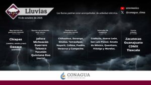 Lluvias aisladas (0.1 a 5 mm): Zacatecas, Guanajuato, Ciudad de México y Tlaxcala.