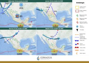 Intervalos de chubascos (5 a 25 mm): Coahuila, Nuevo León, San Luis Potosí, Estado de México, Querétaro, Hidalgo y Morelos.